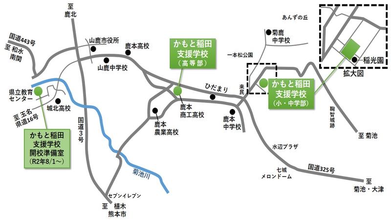 かもと稲田支援学校は、小・中学部の校舎と、高等部の校舎が別の場所にある、熊本県で初めての特別支援学校になります。