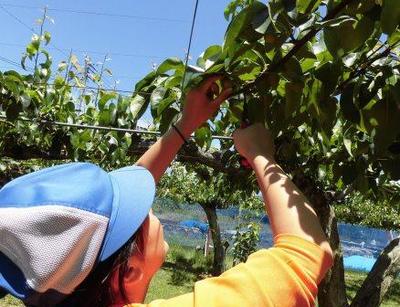 | 今日は、3年生活科学科の生徒が「ナシの摘粒」を行いました。 |