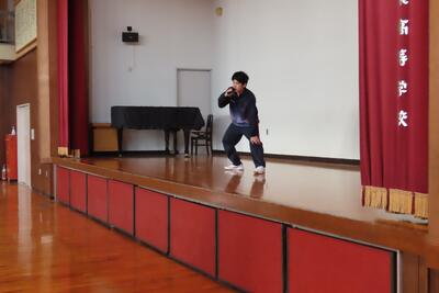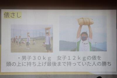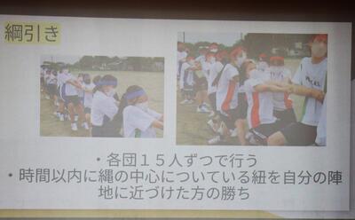 まずは、体育大会の競技種目説明です。100m走、俵さし、綱引き、長縄跳び、リレーなど、お決まりの種目の説明をささっと済ませ、農業クラブ考案の種目と、生徒会・家庭クラブ考案の種目の説明に移ります。
