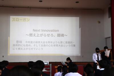 「Next Innovation ~燃え上がらせろ、闘魂~」のスローガンのもと、笑顔いっぱいの体育大会になるように願っています