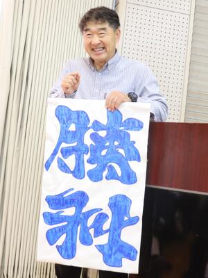 実はこれ、ひっくり返すと別の文字に見えるアンビグラムというものでした。すごい(スマホで見てる人はひっくり返して見てみよう!)挑戦を続けていくと勝利に繋がっていくという熱いメッセージを先生に伝えていただきました