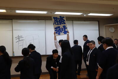 集合写真も撮りました。「挑戦」という文字と「勝利」という文字を掲げています。