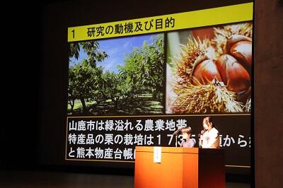 当日は緊張しましたがこれまで取り組んだ和栗と赤鶏のプロジェクト研究の成果を発表しました。結果は意見発表は最優秀賞
