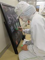 2年食品科学科の生徒が前日から準備をしましたホワイトボードを描いたり、お土産のクッキー製造、ラッピング、器具の準備など心を込めて準備しました!!