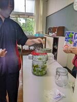 まずは2年生の授業風景です!へたを取り除き、きれいに洗って水けをふきとりました。計量後、氷砂糖と梅を交互に入れました