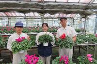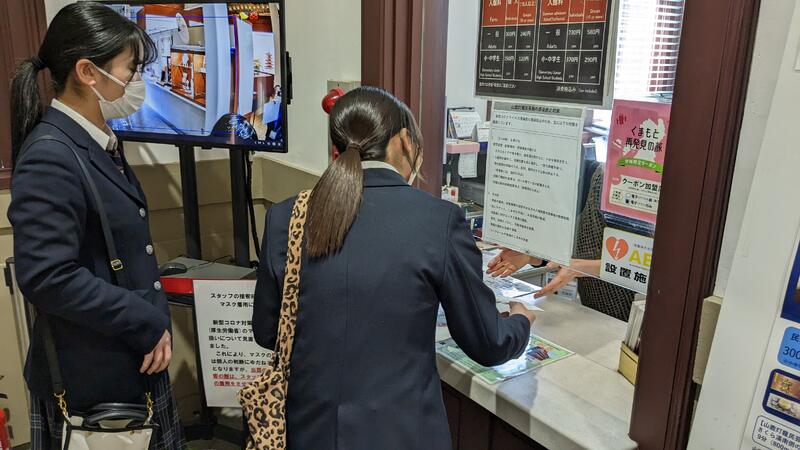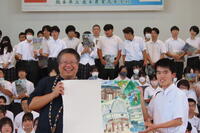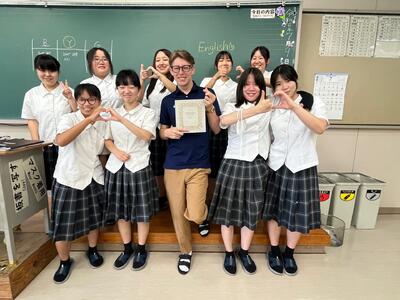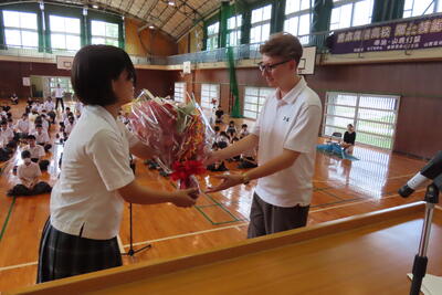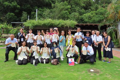 帰国するにあたって、山鹿のうちわ、花束、くまモンの帽子、鹿農生の心のこもったメッセージカードをプレゼントしました