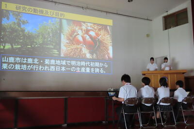 当日は緊張しましたがこれまで取り組んだ和栗と赤鶏のプロジェクト研究の成果を発表しました。結果は意見発表は最優秀賞
