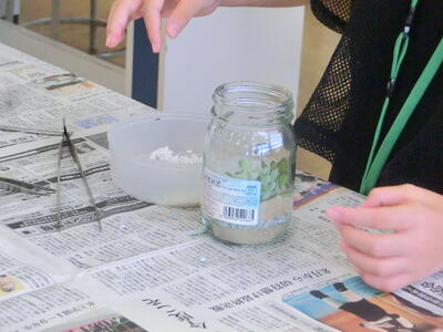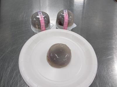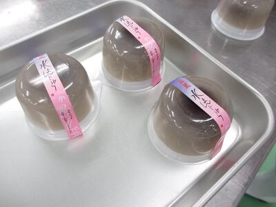 3年生の製菓は主に1学期は和菓子を学んでいます。材料のわらび粉や葛粉(くずこ)のデンプンが加熱され柔らかくなる特徴を利用して作ります。出来上がった水まんじゅうは透明で美味しそうです