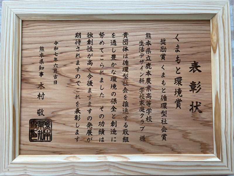 その奨励賞(くまもと循環型社会賞)を生活デザイン科 学校家庭クラブが受賞しました。