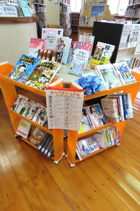 新しく入った本は図書館入口正面に置いてあります。
