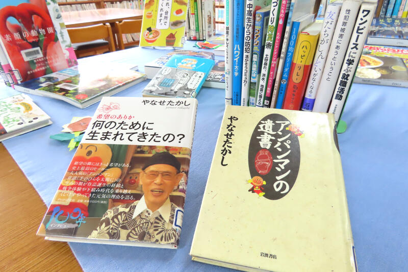 閲覧スペース中ほどの机には、今年春の連ドラで話題のやなせたかしさん関連の本があります。