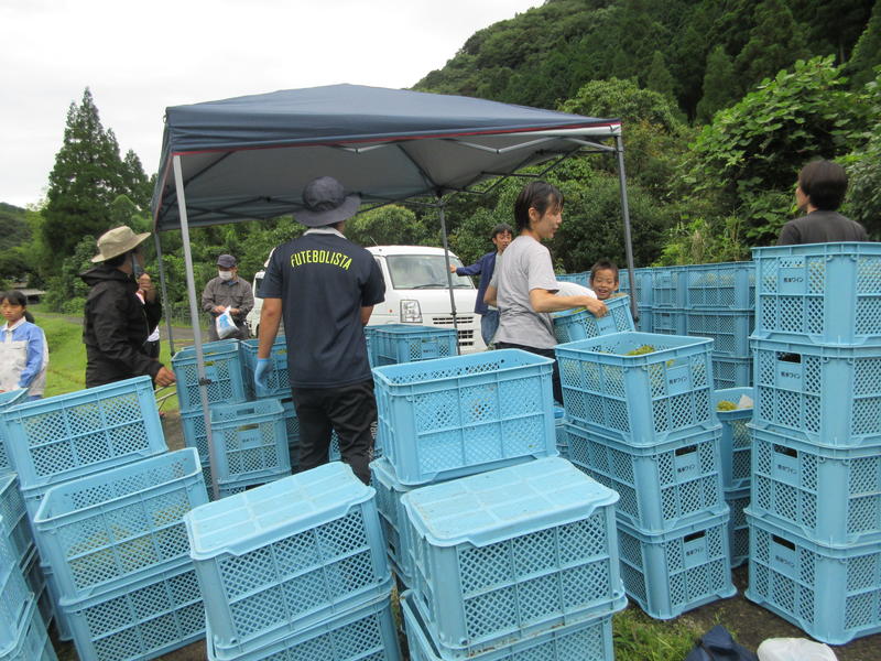 コンテナいっぱい収穫できました。コンテナは熊本ワインの工場に運ばれます。