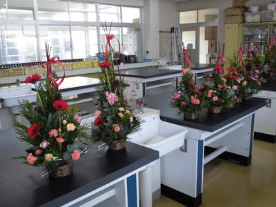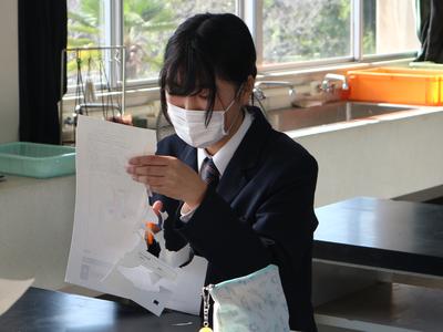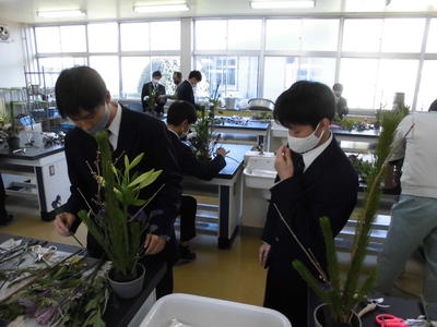 1年園芸技術科と生活デザイン科の「科学と人間生活」の授業で、ペーパークロマトグラフィー法による光合成色素の分離実験を行いました。