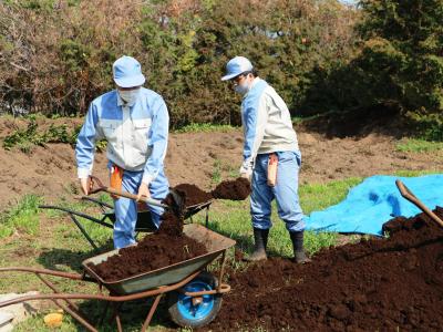 この畝にはダイコン、ニンジン、ハクサイ、ジャガイモを植えるのだそうです。(おいしい鍋ができそうです:笑)