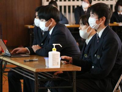 意見発表大会は県大会から九州大会・全国大会へとつながる大会で、今日の大会が学校代表の選考会を兼ねています。例年は体育館に全校生徒が集まって行うのですが、新型コロナウイルス感染拡大防止の観点から、今回はリモート開催となりました。