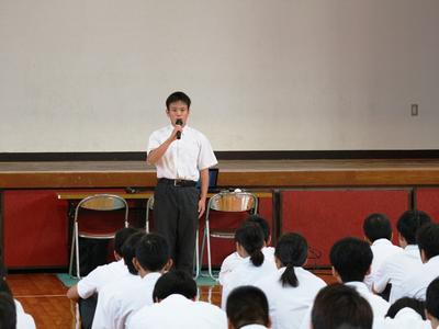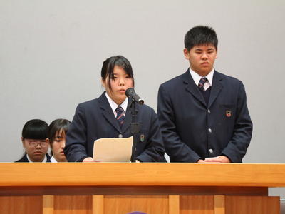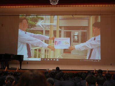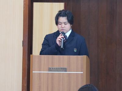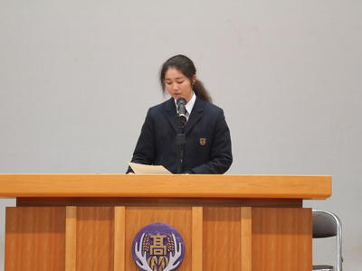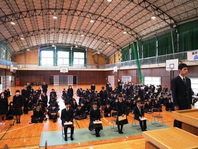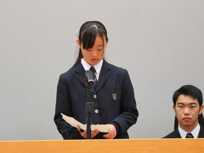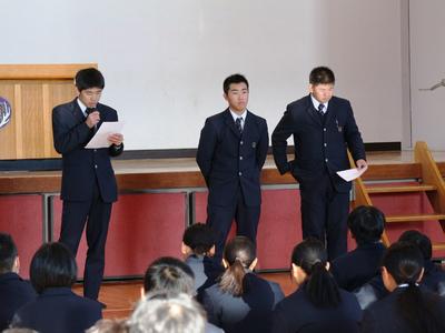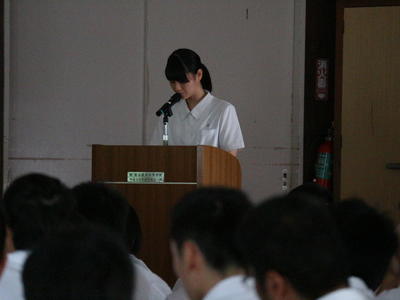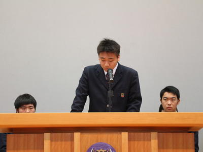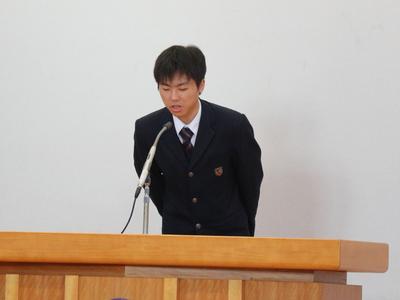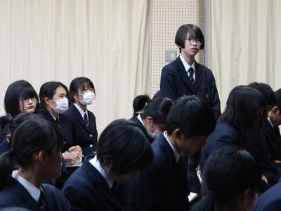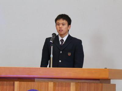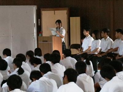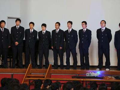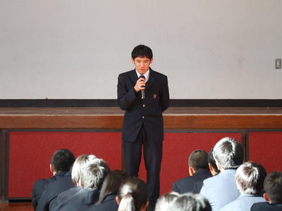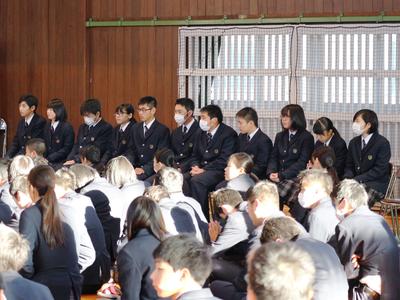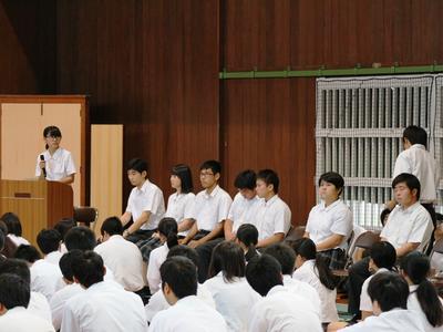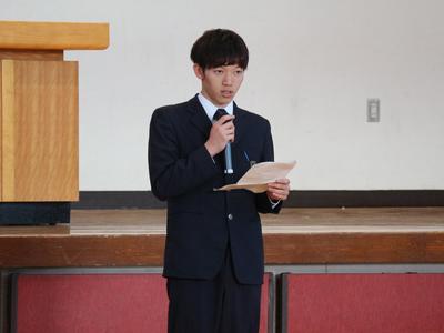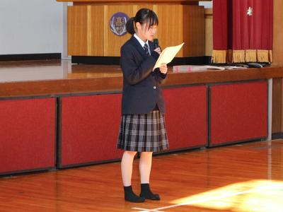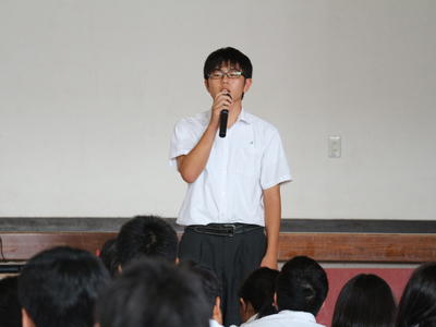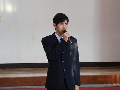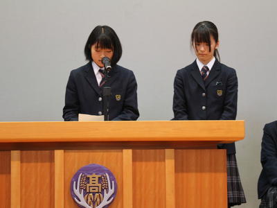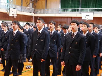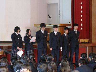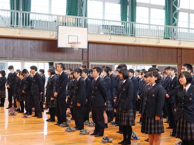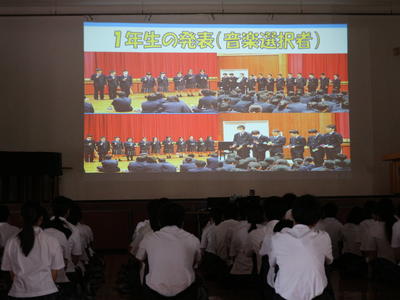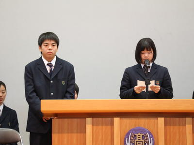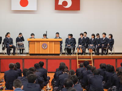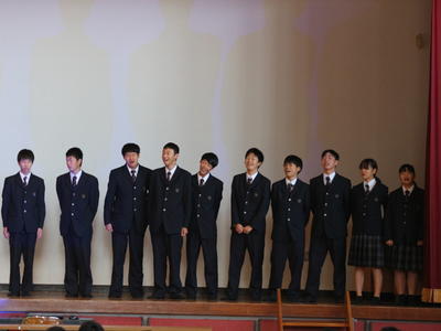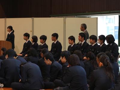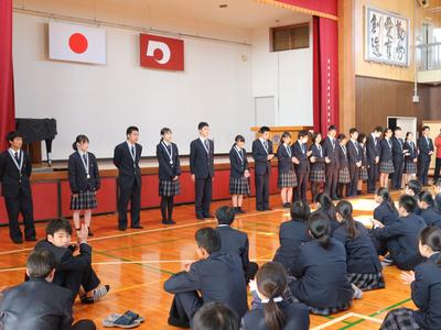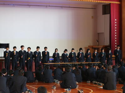 始めて参加する1年生は、特に興味津々で見ていました。 校歌斉唱 閉会 生徒会副会長 |