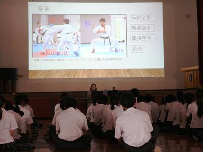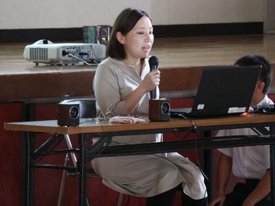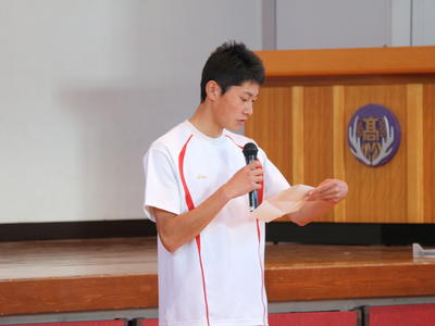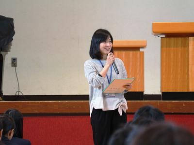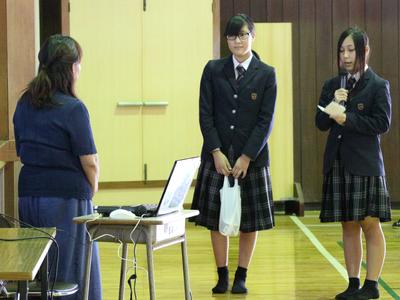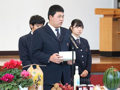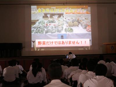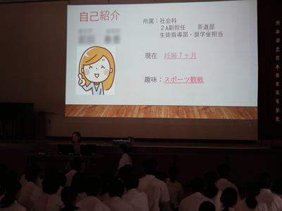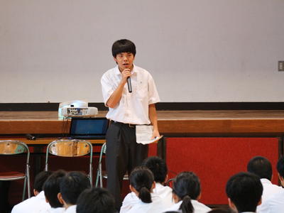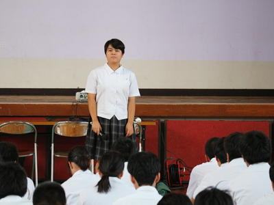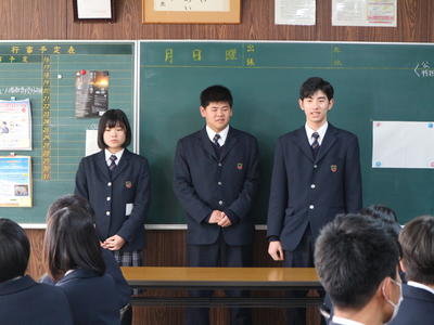 9月4日(水)、第3回鹿農集会(全校集会)を行いました。 開会 生徒会役員 生徒会長あいさつ 職員講話 今年本校に来られたばかりということもあり、自己紹介が中心です。 生徒からのリクエストが多かった、おなかの中の赤ちゃんと小さい頃から続けている空手について主に話してくださいました。 赤ちゃんの話ではエコーの動画も見せてくださいました。 空手についてのお話では、「広報の方ですか?」というくらい、オリンピックの空手競技について熱く語ってくださいました。 鹿農祭(文化祭)について 昨年の様子をスライドで見ながら、生徒会副会長から説明がありました。
