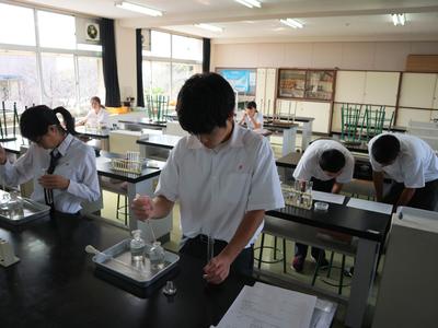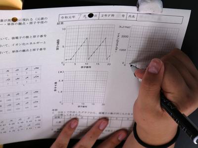 食品工業科2年の化学基礎の授業で、元素の周期律に関する探求活動を行いました。 元素の周期律とは、元素を原子番号の順に並べたときに性質のよく似た元素が周期的に現れることをいいます。今回は元素の価電子数、イオン化エネルギー、原子半径についてグラフを作成し、変化に周期性が見られるかどうか探求しました。 グラフ作成中です。 単純作業ですが、みんな黙々と取り組んでいます。 グラフができあがったら、ホワイトボードに投射してみんなで確認。(左上:価電子の数、右上:イオン化エネルギー、左下:原子半径) それぞれの値が周期的に変化していることが、一目で分かりますね。 |