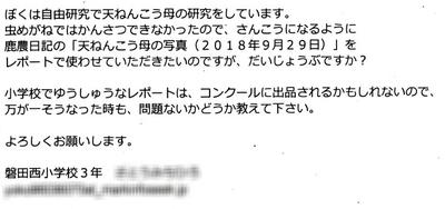 今回、写真の使用についてちゃんと承諾を求めたこと、またHPのURLを載せることについても許可を求めたこと、とてもすばらしい事だと思います。 生徒の皆さん、あちこちのHP上の写真、かってにコピペして使ってませんよね?それ、場合によっては犯罪になってしまいますよ。この小学生を見習って、絶対に無断使用をしないようにしてくださいね。