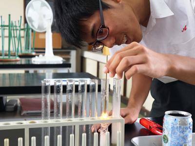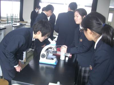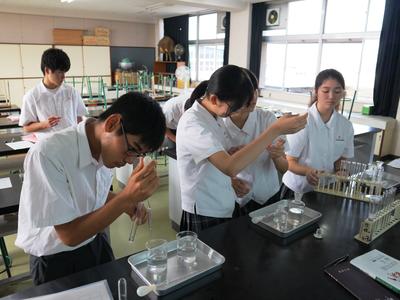調理実習ではありませんよ。タンパク質が金属イオンや酸によって変性することを確認する実験です。 <豆腐作り> 豆乳を ガスバーナーで 温め にがりを加えてしばらく置くと 固まります。豆腐のできあがりです。 豆乳中のタンパク質がにがりの成分(塩化マグネシウム)の影響で変性して固まったものが豆腐なんです。 <カッテージチーズ作り> 牛乳を 温め レモン汁を加えると 白い沈殿と黄色い液体に分離していきます。 これをキッチンタオルを使って濾してやると カッテージチーズのできあがりです。 牛乳に含まれるタンパク質がレモン汁に含まれる酸によって変性して沈殿し、カッテージチーズができました。 <試食> せっかく作ったんですから、食べてみました。(これがメインだったりして笑) ※今回使ったビーカーなどの器具はこの実験専用なので、安全性はご心配なく。 豆腐はそのままビーカーからすくって食べました。 ダイズの味が濃くて、とてもおいしかったです。 (みんながビーカーから豆腐をすくって食べている光景はとてもシュールで、前から見ていてとてもおもしろかったです笑) カッテージチーズはクラッカーに塗って食べました。 レモン汁を加えているため酸味が強く、「レアチーズケーキみたい」という声が上がりました。 もったいないので、分離した液体も味見しました。 味は...スポーツドリンクと言えなくもないような... とりあえず身体には良さそうです。 <生徒の感想より> 〇実際に豆腐やチーズの原料を合わせて、液体が固体に変わる瞬間を見る貴重な体験ができたので、よかったです。 〇変性は温度だけでなく、ある物質が加えられることでも起こることを知った。 〇にがりやレモン汁を入れただけで、あんなにもすぐに変化が出るのだと驚いた。 〇豆腐はおもったよりもおいしくできた。カッテージチーズは、レモン汁の味が強いがチーズ嫌いでも食べられるおいしさだった。 〇豆腐は少しにがりが苦かったけど、そのままでもおいしかったです。しょうゆを入れると、さらにおいしかったです。チーズはそのままだと少し酸味がありました。クラッカーや塩を入れるとおいしかったです。 |
