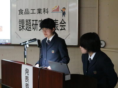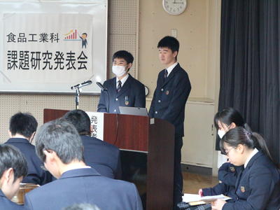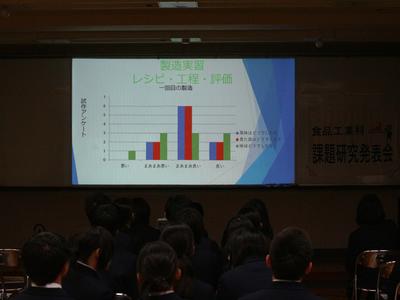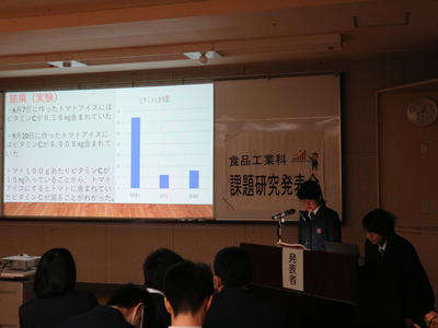 本校3年生は各科とも課題研究に取り組み、その成果を科ごとの発表会で先生方や後輩たちに発表します。昨日(1/16)は食品工業科の課題研究発表会が開かれました。 司会進行は2年生が担当しました。 1~2人で取り組んだ研究内容を、スライドを使って説明します。 発表後は生徒や先生から質問や意見が出されます。 どんな質問が来るかわからないので、発表よりも緊張します。 発表が終わったら、生徒・職員がそれぞれ採点します。 3年生は前日も遅くまで残って準備に取り組んでいました。 皆さん、お疲れさまでした。 今年度の研究テーマ ※施設園芸科・バイオ工学科・生活科学科の課題研究発表会は、1月30日(木)に行われる予定です。 |