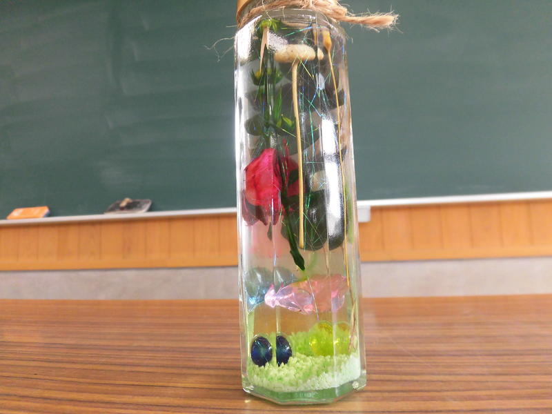 | 1年生が「ハーバリウム」作りをしました。ハーバリウムとは「植物標本」を指す言葉で、オイルを満たしたガラスビンにドライフラワーやプリザーブドフラワーを入れたインテリアフラワーとして人気です。 |