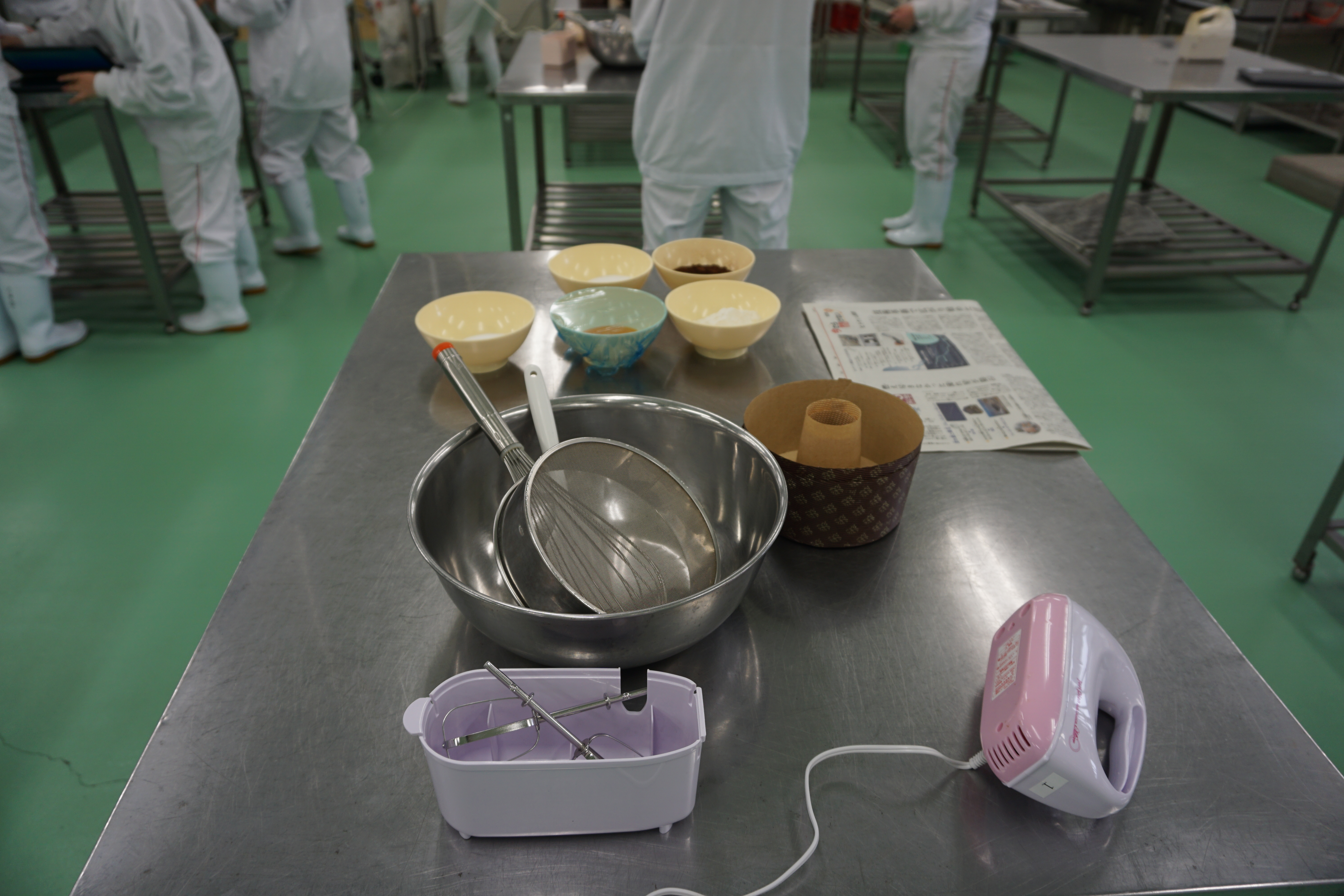 6月8日(水)の5限目、食品製造実習棟の前を通ると食品科学科の3年生がお菓子作りをしていたので、のぞいてきました。課題研究の授業でオリジナルのお菓子の開発に取り組んでいました。