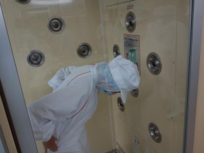 手を洗って紙タオルで拭いたらエアーシャワー室へ