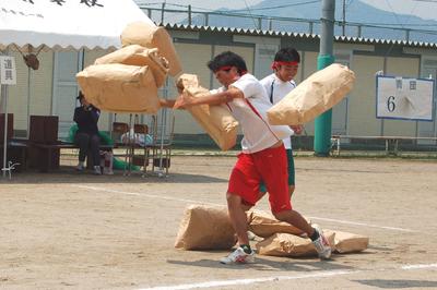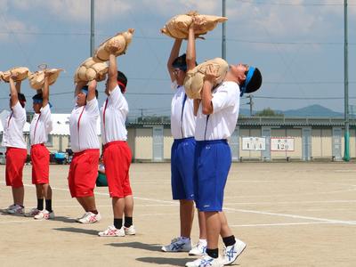 接戦でしたが、青団が先にゴールして学年主任に農作物をプレゼント。青団が勝利しました。 プログラムNo.15 技巧走 まず男女それぞれが、3つの課題に臨みます。 女子 網くぐり ぐるぐるバット 風船を膨らませて、おしりで割ります。 男子 俵運び 一輪車の操作は、以外と難しいです。 ハードル飛び&くぐり クッキーを食べる 口の中の水分が持って行かれるため、想像以上に結構大変です。 それぞれが課題をクリアしたら、同じ団の男女でペアをつくり、共同課題に移ります。 人探し くじで指定された特徴を持つ人を探します。 見つかったら、3人4脚でゴールを目指します。 (つづく) |