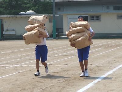 プログラムNo.4 100m走 鹿本農高のスピードスターを決めます。 気持ちに足がついていかないのか、転倒者も続出しました。けがしませんでしたか? 放送係も頑張ってます。 プログラムNo.5 俵さし 女子は12kgの俵を持ち上げます。 優勝は、なんと1年生でした。 男子の俵は30kgです。 3年生がぶっちぎりの優勝。音楽に合わせて踊る余裕さえありました。 (つづく) |