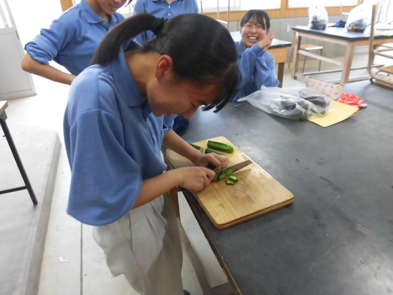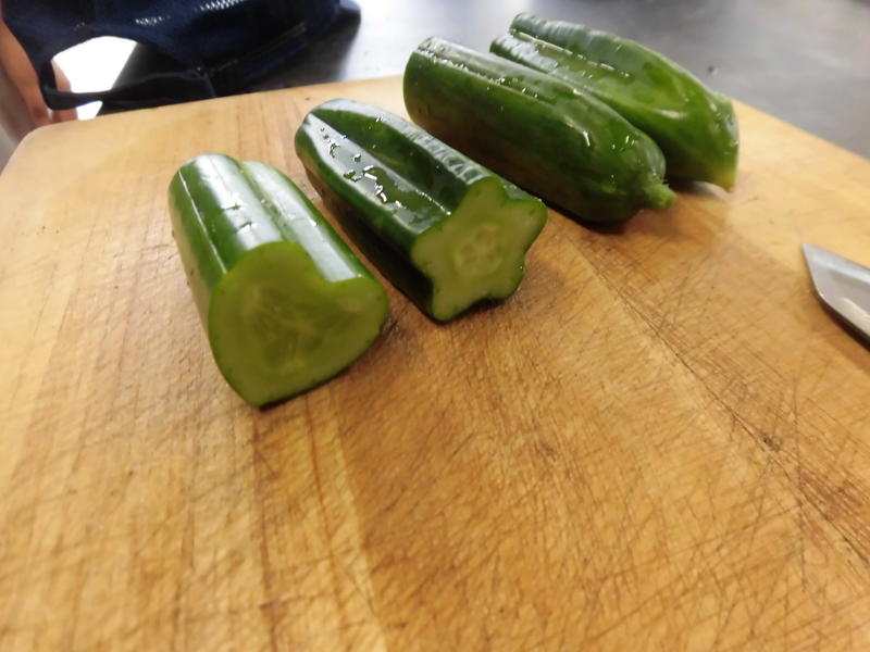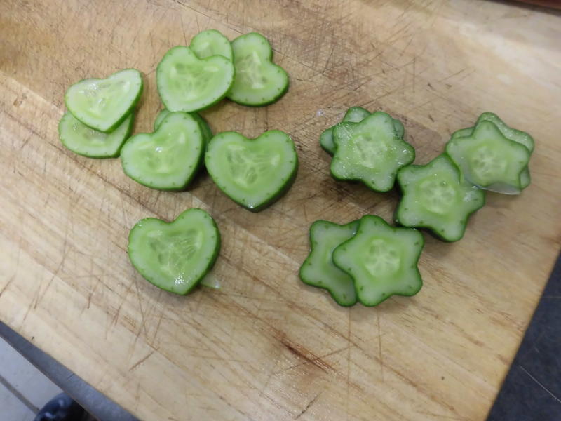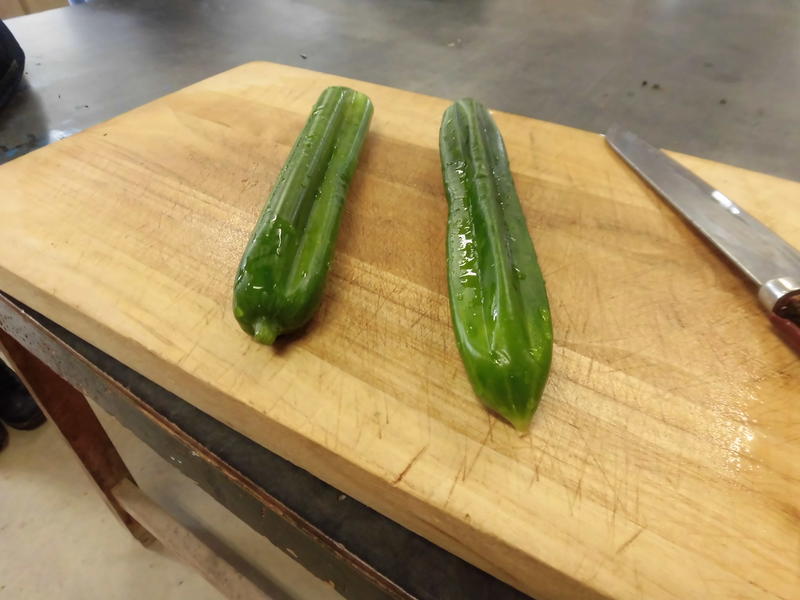 | 生活デザイン科1年生がデコレーションキュウリを作りました。まだキュウリが小さい頃に型枠の中に入れて、数日待つとその形どおりになります。 |