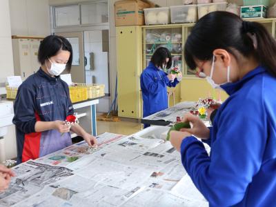 今年も同好会メンバーと生徒会、農業クラブのメンバーで、卒業生へ心を込めたコサージを作りました。