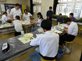 「あずま袋製作体験」では、生徒が一工程ずつ手本を示しながら中学生に教えていました。難しいところは、率先してお手伝いする優しい生徒たちです。きれいなあずま袋が完成していました。