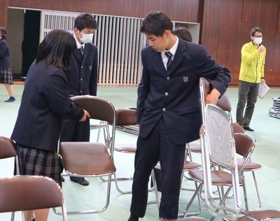 今日の午後は、卒業式の会場設営でした。 設営の担当はバスケット部・サッカー部・バドミントン部・郷土芸能伝承部・三部会(生徒会・農業クラブ・家庭クラブ)役員です。 まず体育館フロアにシートを敷きます。 イスを運び出したら まずはざっと並べ そあと、距離を測りながら整えます。 並べたイスは丁寧に拭いてくれました。 周囲には緑白の幕を張り 正面には式次第などを掲示して 完成です! 日頃から実習で鍛えられているためか、一人一人がてきぱきと動いてくれ、予定よりも早く設営が終わりました。 また、設営担当以外の生徒も、大掃除を頑張ってくれました。 みんな、ありがとう。 |