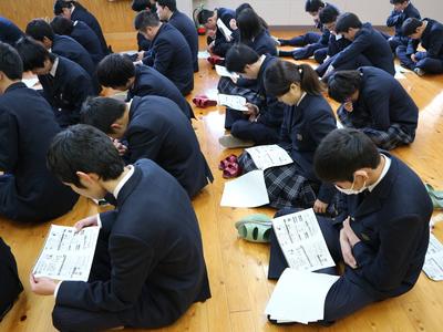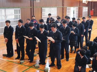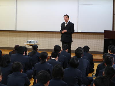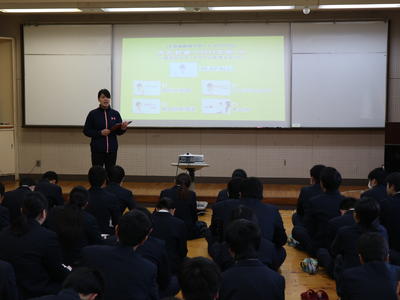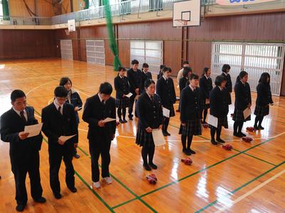 3年生は家庭学習期間に入って2回目の登校日でした。 1限目:学年集会 <進路指導主事講話> 就職・進学を間近に控えた今、気をつけなければいけないことは何か。最近問題になっているSNSへのおふざけ投稿なども例に挙げながら、話がありました。 研修先で撮った写真を軽い気持ちでSNSに投稿したら、そこに部外秘の情報が写っていた、なんてことも起こりえます。そうなると内定取り消しはもちろん、莫大な補償を請求されることも。絶対にやめましょう。 <進路模試成績上位者表彰> 2年生から行ってきた進路模試の、成績上位3名が表彰されました。豪華な(?)副賞付きです。 よく頑張りました! <消費者教育> 社会に出たばかりの若者がお金のトラブルに巻き込まれるケースが、とても増えています。昨年度、なんと39,000人!そのようなトラブルに生徒たちが巻き込まれないように、契約やキャッシング、ローンなどについて学習をしました。 講師は地歴公民の先生です。自身の実体験も交えた話は、リアリティ満点です。 DVDやプリントを使いながら、気をつけるべきポイントを押さえていきます。 みんなの押印やサインは、これから先重要な意味を持つようになってきます。十分に注意してください。 2限目:式歌練習・整容指導 <式歌練習> 卒業式では「君が代」「仰げば尊し」「鹿本農業高校校歌」の3曲を歌います。大きな声で歌えるよう、練習しました。 伴奏は施設園芸科の担任の先生です。すごい! まずみんなで一緒に歌ったのですが、 声が小さいので、クラスごとに歌うことに。 施設園芸科 食品工業科 バイオ工学科&生活科学科 声が小さいとやり直しです。何度も繰り返すうちに、徐々に大きな声が出るようになってきました。 最後にもう一度全員で歌います。 最初とは比べものにならないくらい、大きな声が出るようになりました。すばらしい! <整容指導> 男女に分かれて、卒業式に出席するときの身だしなみを確認します。 中には、ちょっと髪が伸びすぎの生徒も見受けられました。 卒業式まであと1週間ほどです。早めに整えておいてくださいね。 次の登校日は2月27日(水)です。入退場や卒業証書の受領など卒業式の練習をしますので、欠席することがないよう体調を整えておいてくださいね。 |