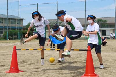 ボールが乗ったブルーシートがバトン代わりの技巧リレーです。