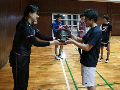 卒業を1週間後に控えた3年生を招いて、送別試合を行いました。 数ヶ月ぶりにラケットを握る3年生もいます。けがをしては大変なので、1時間ほどかけて入念にウォーミングアップを行いました。 試合は学年対抗のシングルスで行いました。 3年生の最後の雄姿をご覧ください。 勝率や総得点数・総失点数などで順位を付け、上位者には商品が贈られました。 優勝 2年生 第2位 3年生 第3位 3年生 第4位 3年生 第5位 2年生 この後も、時間いっぱいまでダブルスの試合で盛り上がりました。 3年生の皆さん、お疲れさまでした。卒業しても、たまには体育館に顔を見せてくださいね。 |