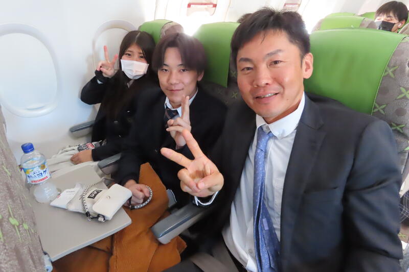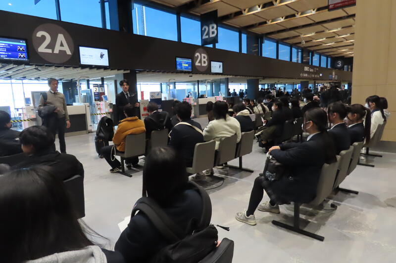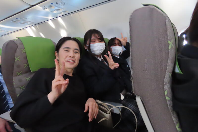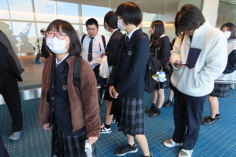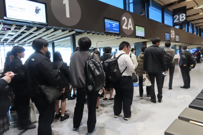 7時50分に熊本空港に到着し、無事全員搭乗口までたどり着きました!今は搭乗案内を待っているところです。まだわくわく感が先で、皆笑顔です☺️