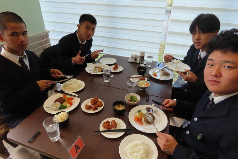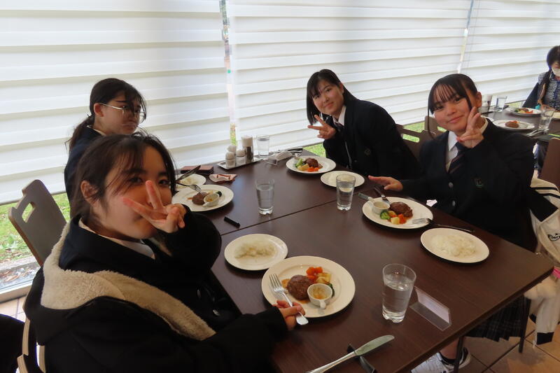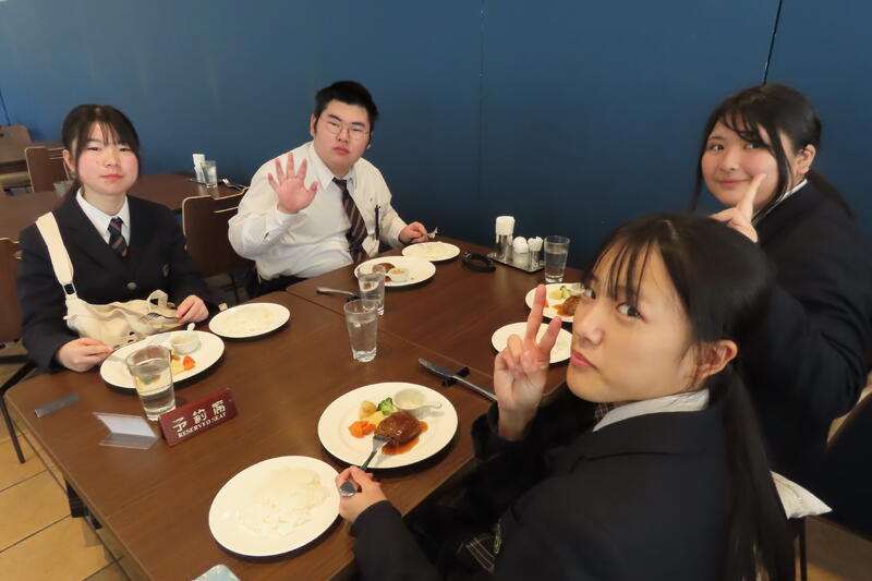 都内が渋滞で15分遅れの12時45分に到着しました。朝早く空腹だった生徒たちも一目ハンバーグ定食を見ると、顔色が良くなり笑顔に!エネルギーをチャージしました