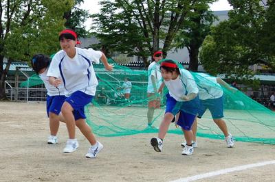 接戦でしたが、青団が先にゴールして学年主任に農作物をプレゼント。青団が勝利しました。 プログラムNo.15 技巧走 まず男女それぞれが、3つの課題に臨みます。 女子 網くぐり ぐるぐるバット 風船を膨らませて、おしりで割ります。 男子 俵運び 一輪車の操作は、以外と難しいです。 ハードル飛び&くぐり クッキーを食べる 口の中の水分が持って行かれるため、想像以上に結構大変です。 それぞれが課題をクリアしたら、同じ団の男女でペアをつくり、共同課題に移ります。 人探し くじで指定された特徴を持つ人を探します。 見つかったら、3人4脚でゴールを目指します。 (つづく) |