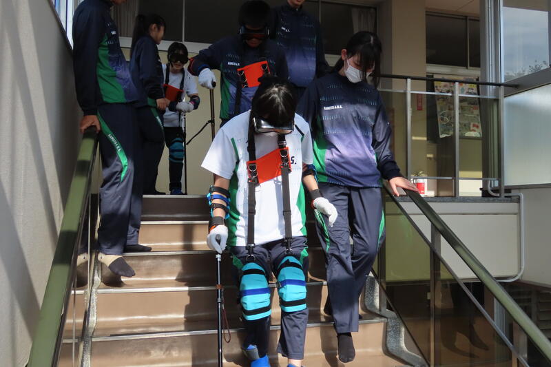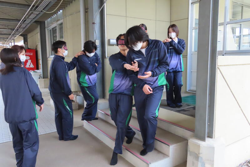 視覚が不自由になると、いつも通りに動くことが困難になり、恐るおそる動く生徒たち。