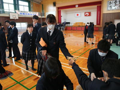 1月に行われた「山鹿市防災の日」のイベントに生徒会役員が参加した際、150人分の防災非常食をいただきました。本日の修了式の機会に、生徒・職員で体験・試食をすることにしました。 まずは生徒会長から説明。 料理に移ります。 お米と具材を袋に入れ お湯を注ぎます。 生徒も職員も、興味津々。 袋の口をしっかりと閉じて ダンボールを閉じて保温すること、15分。 諸連絡が終わる頃には ほっかほかの炊き込みご飯ができあがり! 容器に分けて みんなに配りました。 思いがけないプレゼントに、生徒たちは大喜び。このあと教室で試食をしました。 防災非常食とはいっても味もとても良く、被災したときにこのご飯が食べられれば、辛さや怖さ、不安が少しは和らぐような気がしました。食べ物にはそのような効果もあるのだなぁ...と感じました。 |