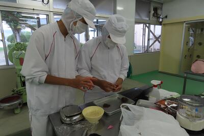 【3F】課題研究 投稿日時 : 2022/06/09 情報広報部 6月8日(水)の5限目、食品製造実習棟の前を通ると食品科学科の3年生がお菓子作りをしていたので、のぞいてきました。課題研究の授業でオリジナルのお菓子の開発に取り組んでいました。同時進行で、後片付けもてきぱきと進めていました。