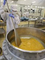 材料を準備し、八朔果汁を大きな釜で熱していきます。砂糖を添加して、屈折糖度計で糖度を確認します。