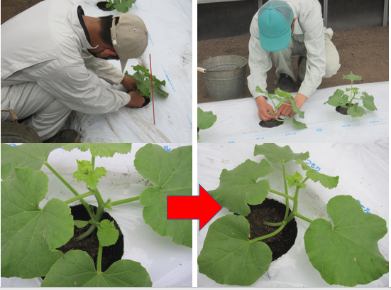 メロンの子葉とわき芽を切除しました。切除する葉やわき芽と切除してはならない葉を判別することができるようになりました。