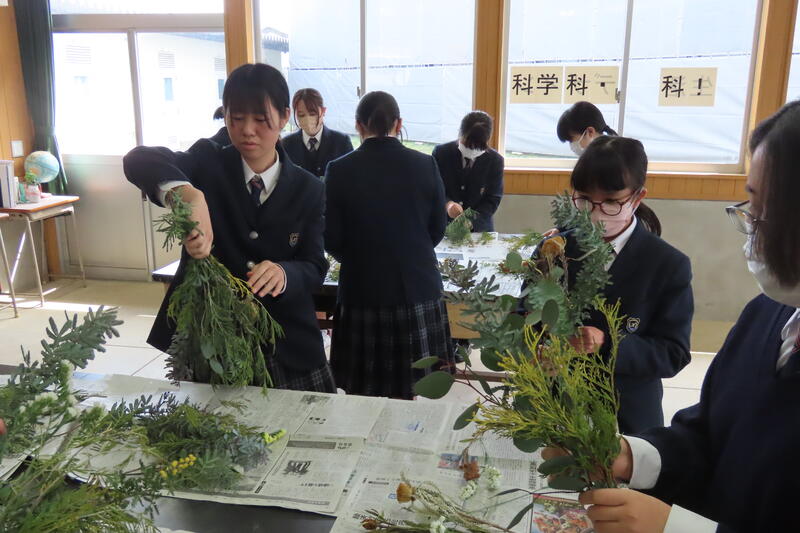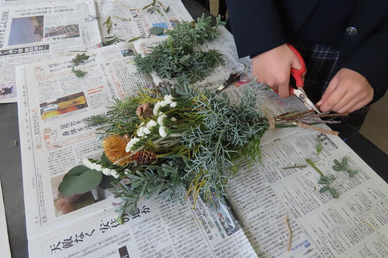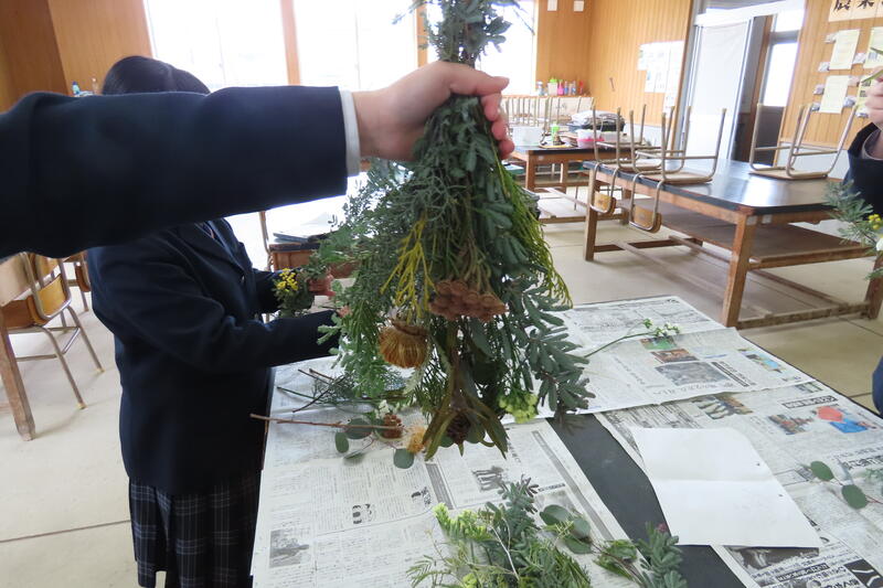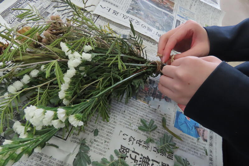 表裏や形が決まったら、麻ひもでしばり、リボンをつけました