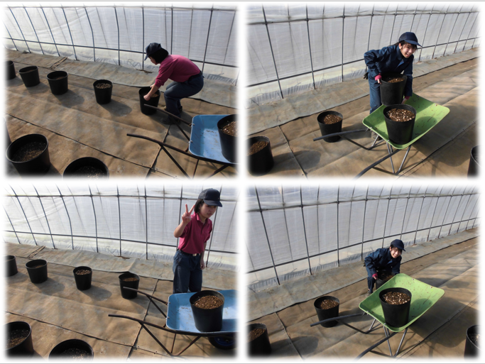 前回の続きでポットに土を詰めていきます。2回目なので要領よく出来ています。