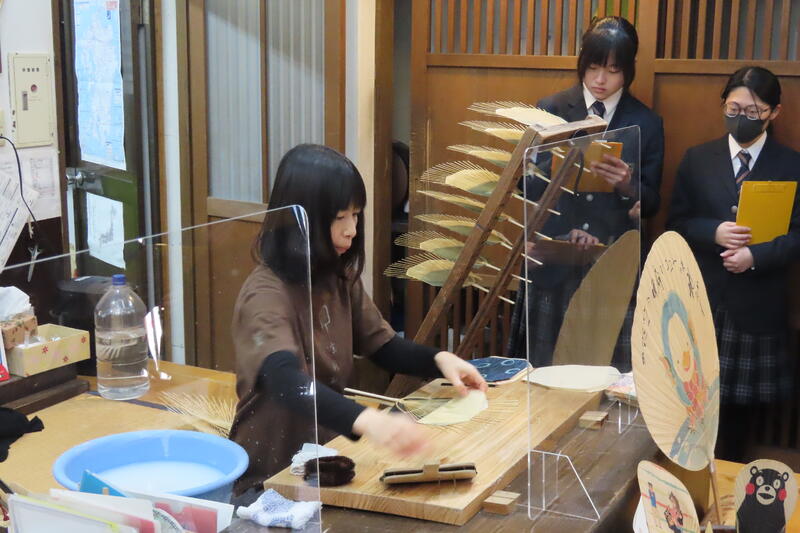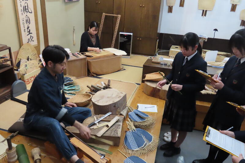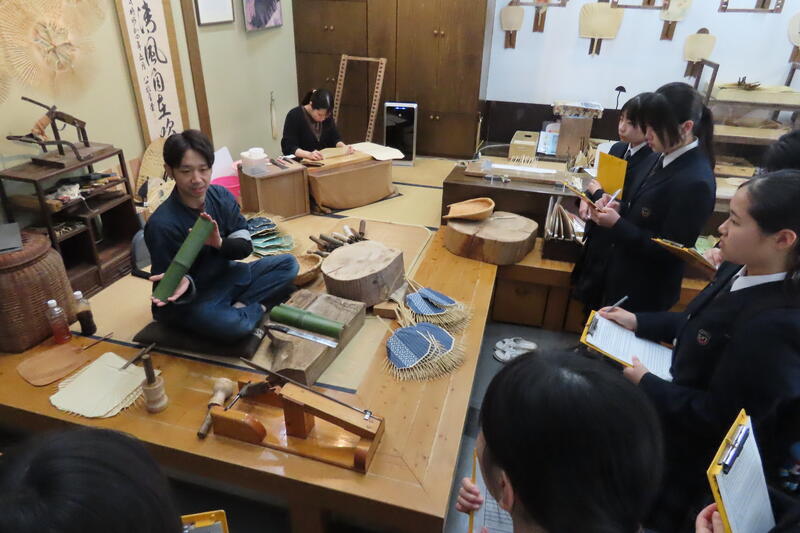 来民うちわを作られている「栗川商店」では、五代目の栗川恭平さんに説明と実演をしていただきました。