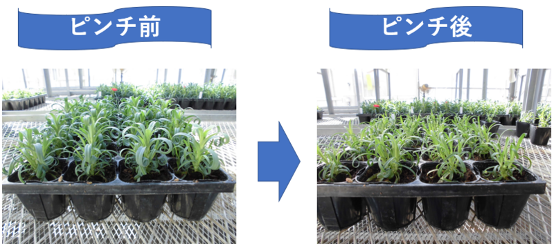 摘心は草姿を整えるために、茎頂部を摘み取り側枝の発生を促し一株当たりの花数を増やすために行っています。
