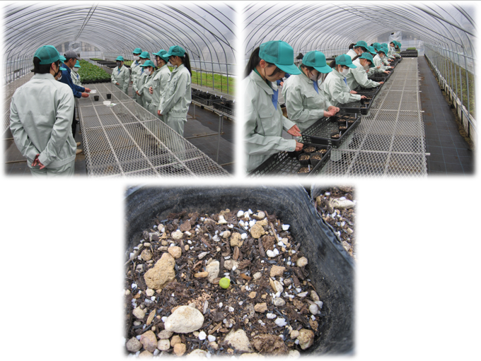 ハウス内だとまだまだ夜温が低いのでガラス温室内の育苗用トンネルで発芽させます。